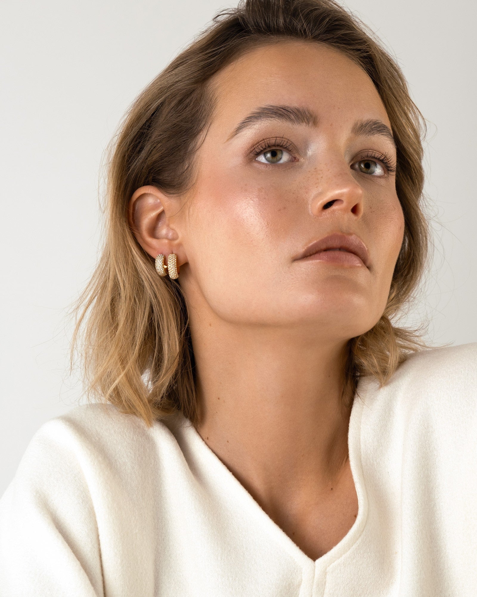 Elegant hoops adorned with sparkling cubic zirconia stones. Crafted from solid stainless steel with 18K gold PVD plating, making them both durable and water-resistant. They retain their color and shine over time.