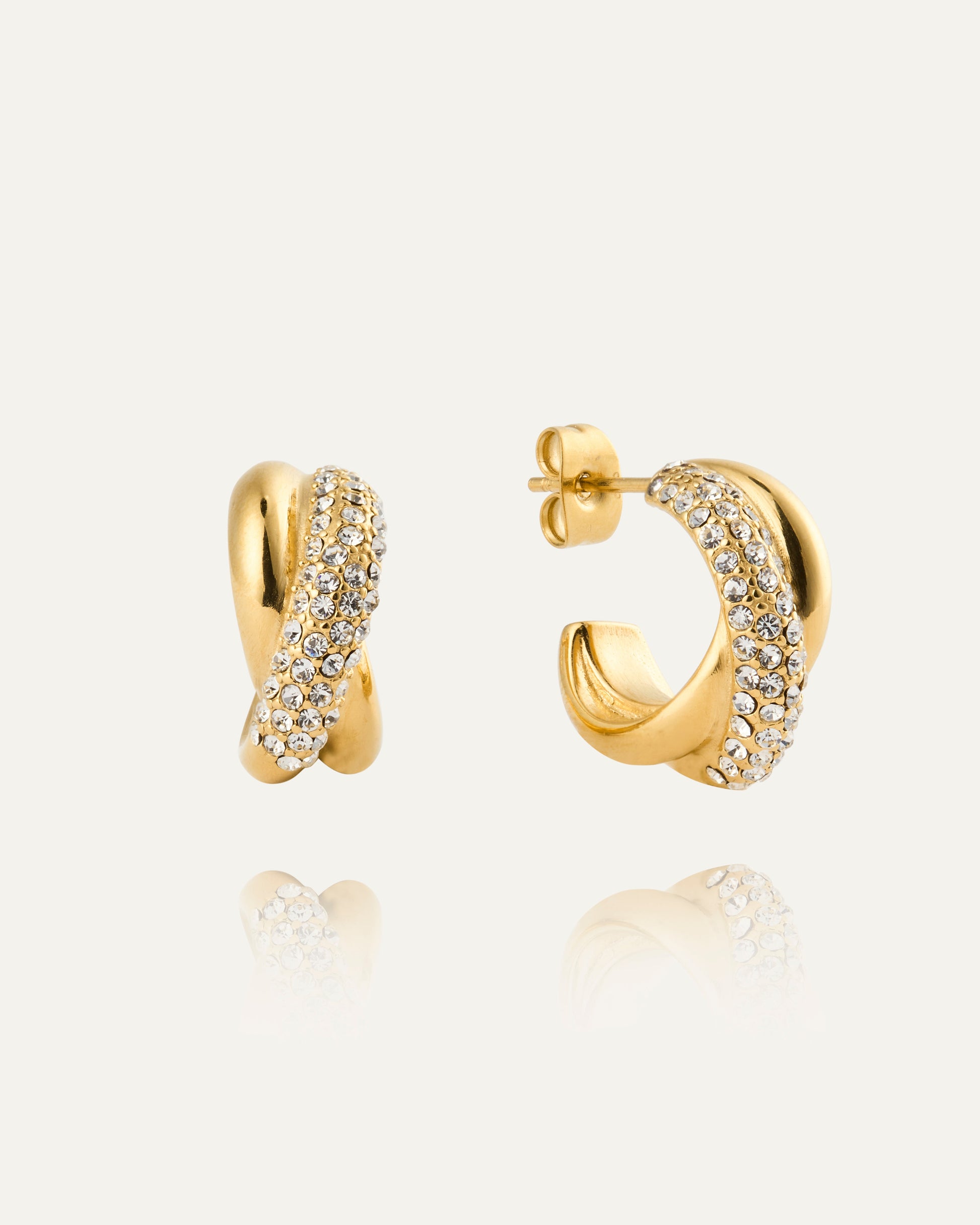 Warm shine in a delicate design. Aurora Gold Hoops combine a classic creole style with white Preciosa stones for a distinct yet soft expression – just as beautiful on their own as paired with other jewelry.