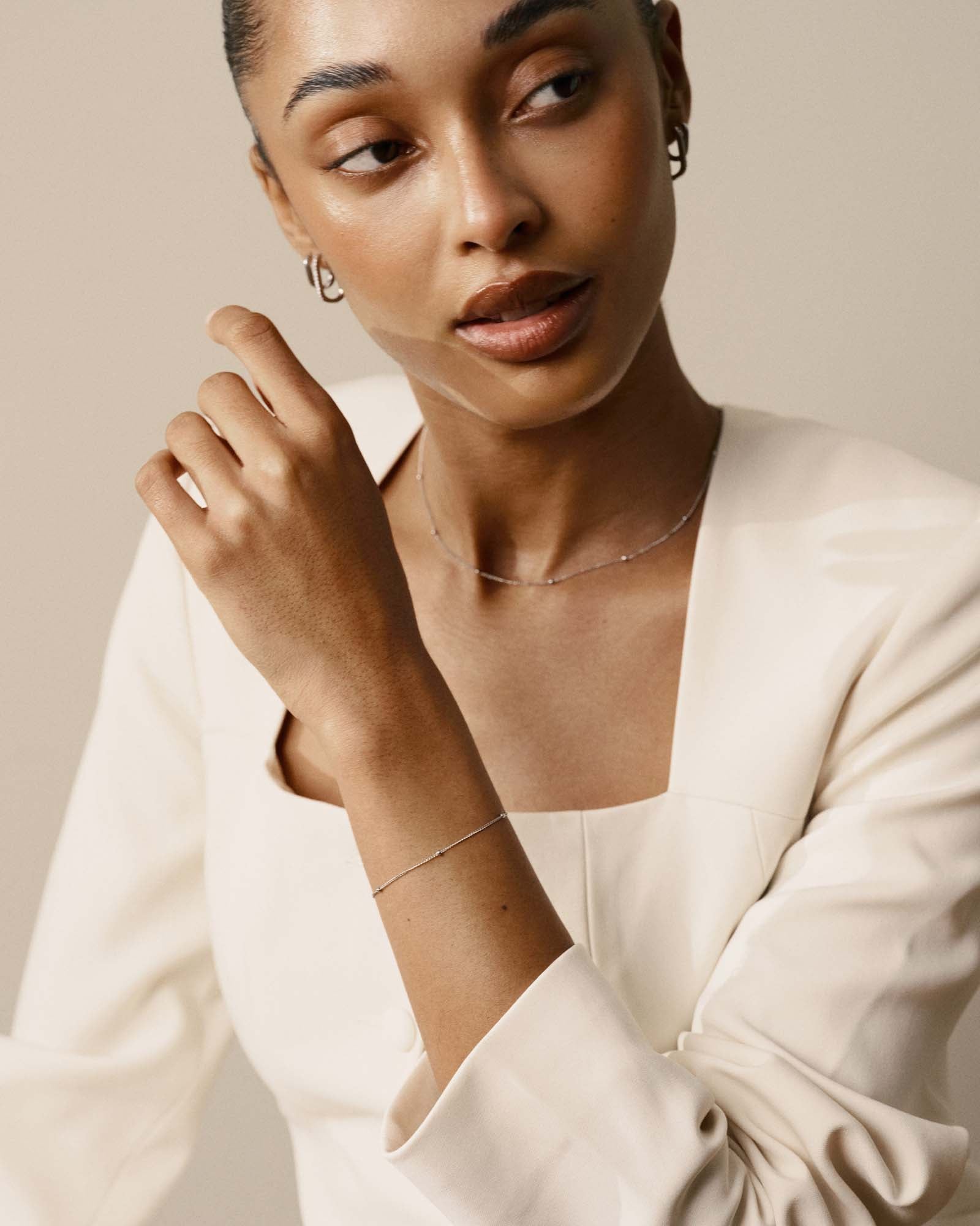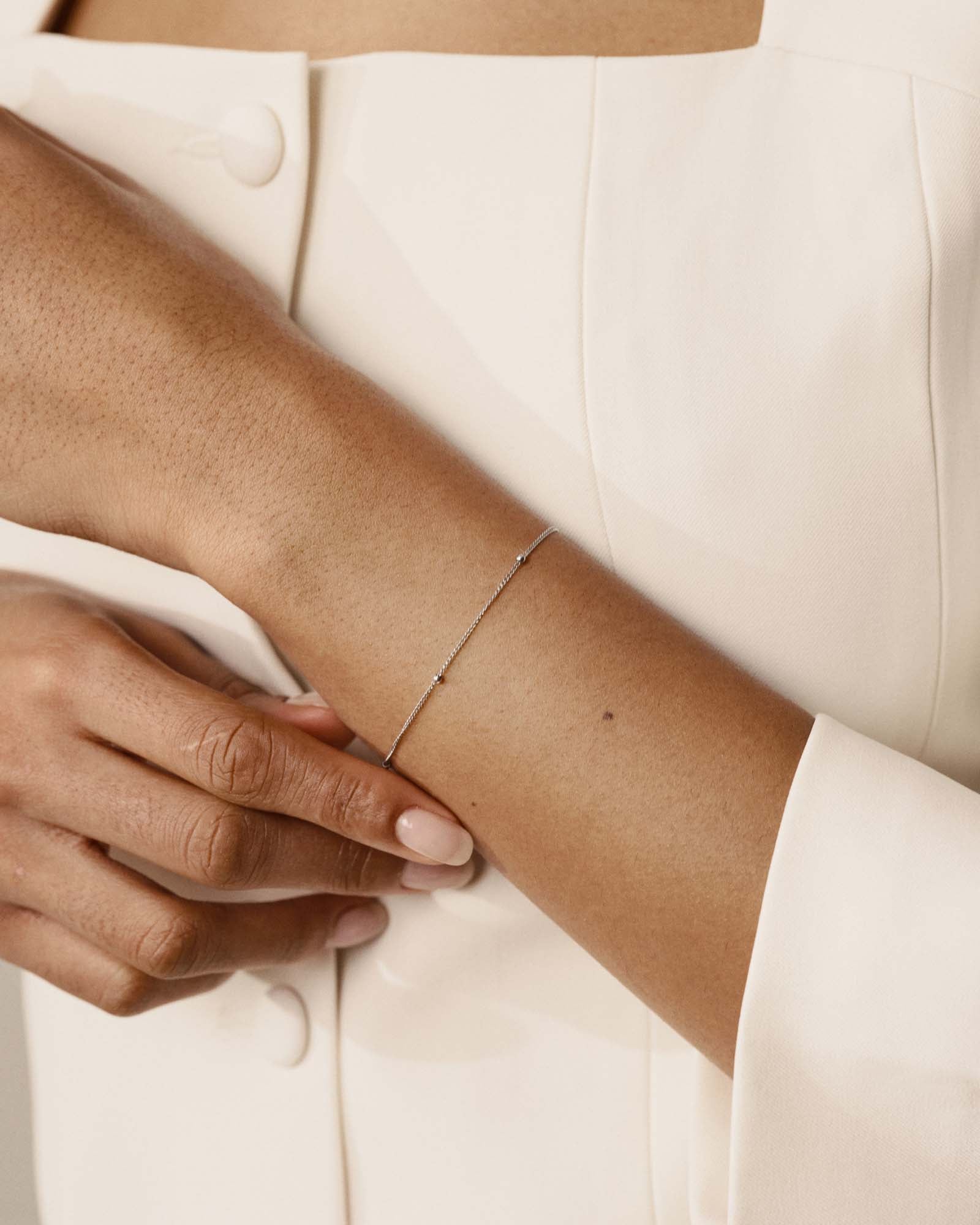The beaded bracelet has a soft, tactile quality that makes it a joy to wear, smooth round links that catch the light without ever feeling overdone. A quiet essential that layers beautifully or holds its own all on its own.