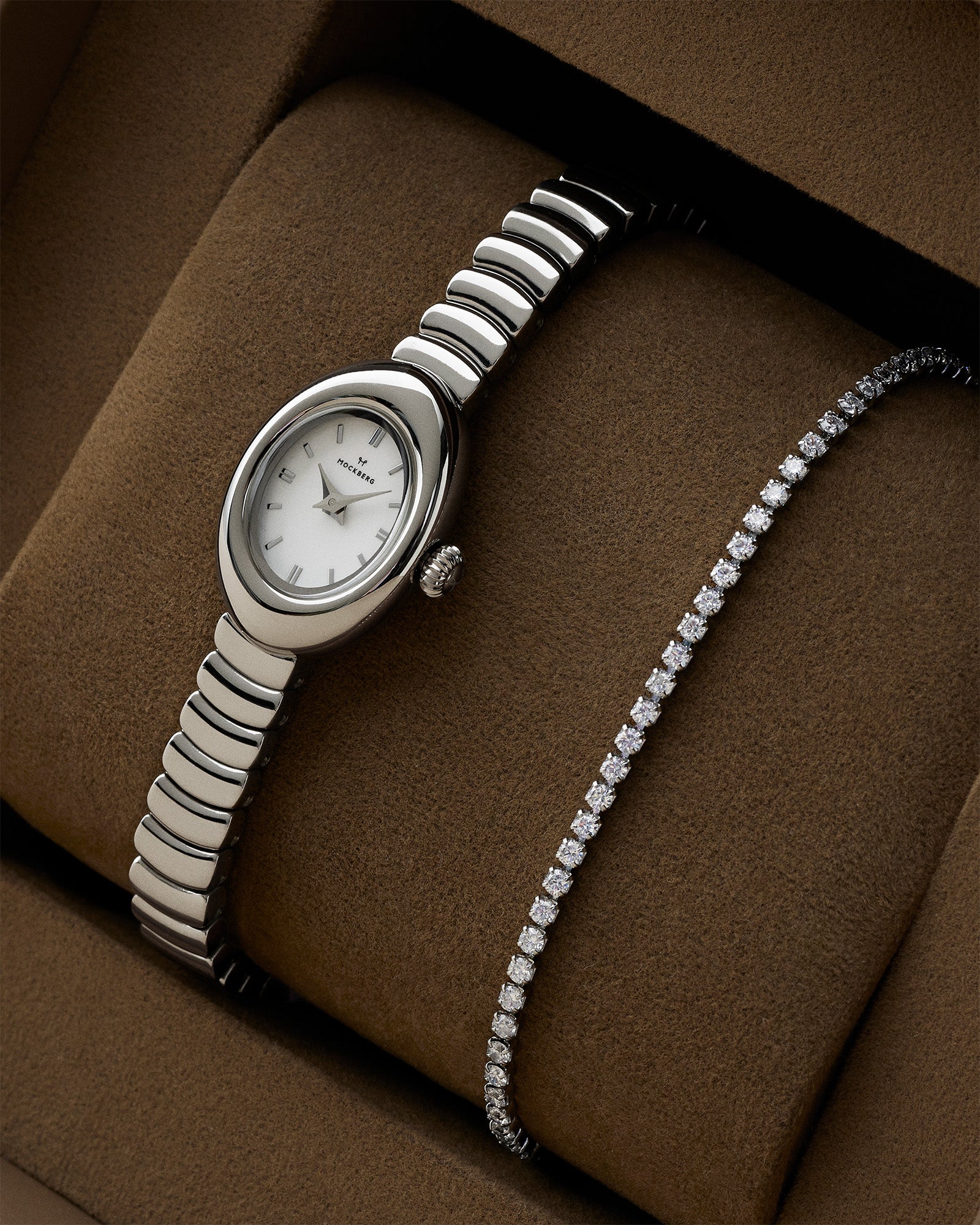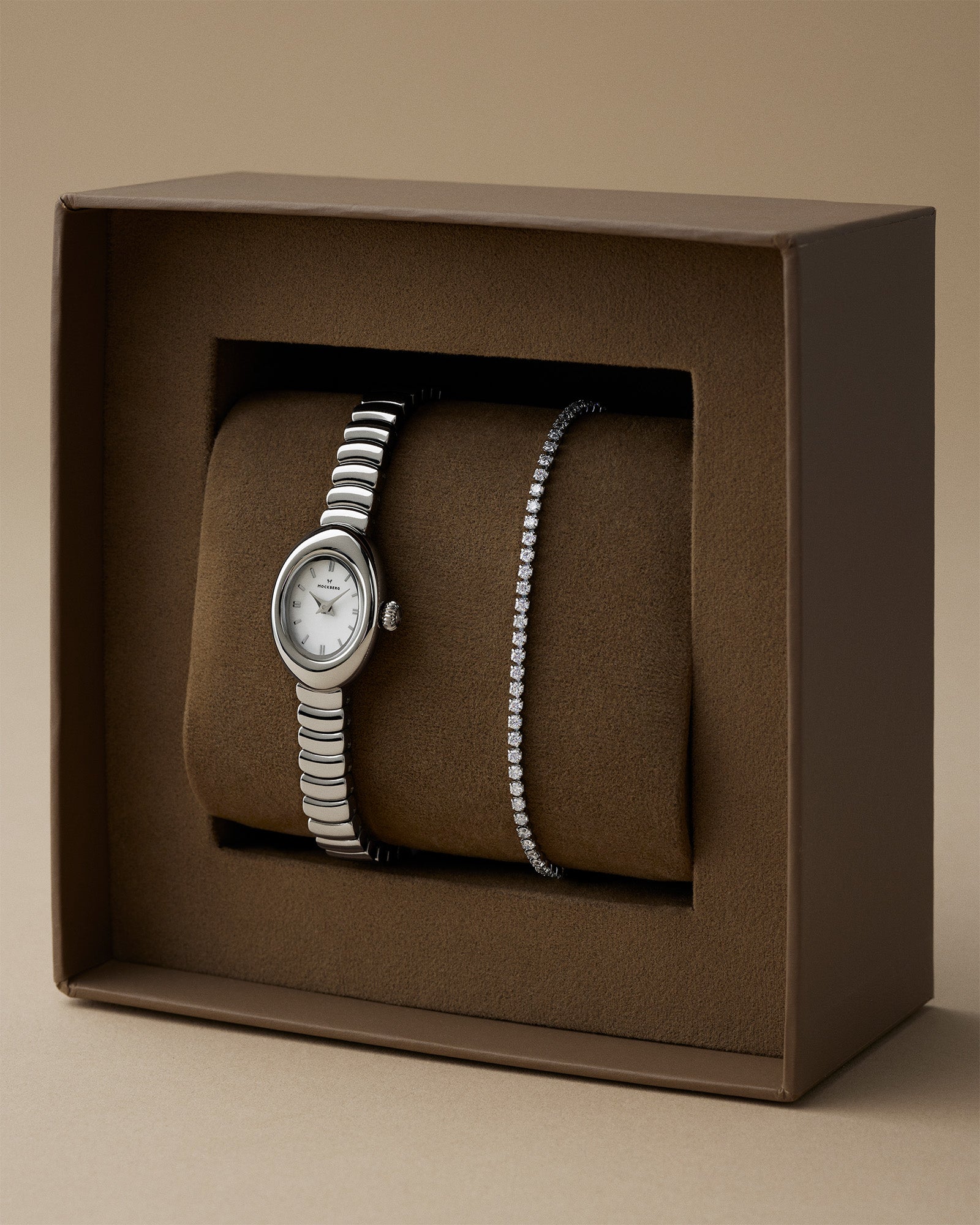 Mockberg’s gift set with the Belle Oval Petite watch and bracelet delivers a classic, cohesive look that suits both everyday wear and special occasions. The combination is easy to style and adds a refined touch without overpowering your outfit. The watch and bracelet are delivered together in a gift box.