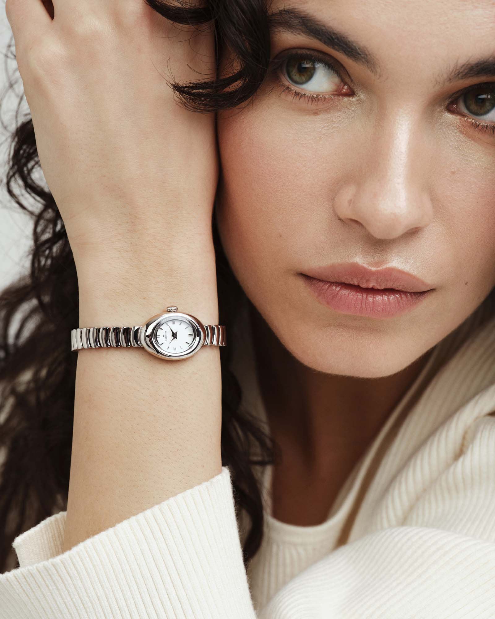 The Belle Oval Petite is a smaller version of the Belle Oval Watch. It features a softly rounded oval case paired with a link bracelet in a curved design. An elegant timepiece suited for any occasion.