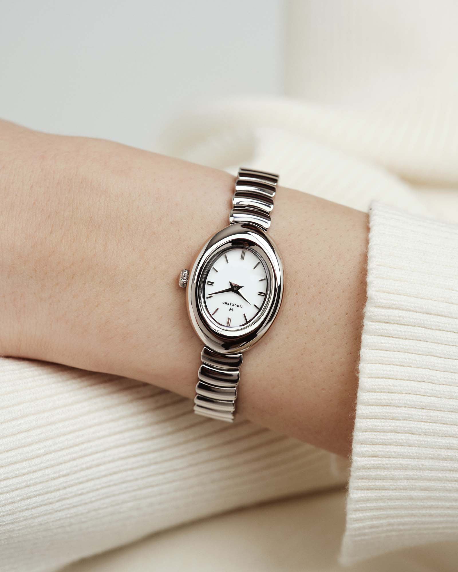 The Belle Oval Watch features a softly rounded oval case paired with a link bracelet in a curved design. A watch that is both refined and easy to wear for any occasion.