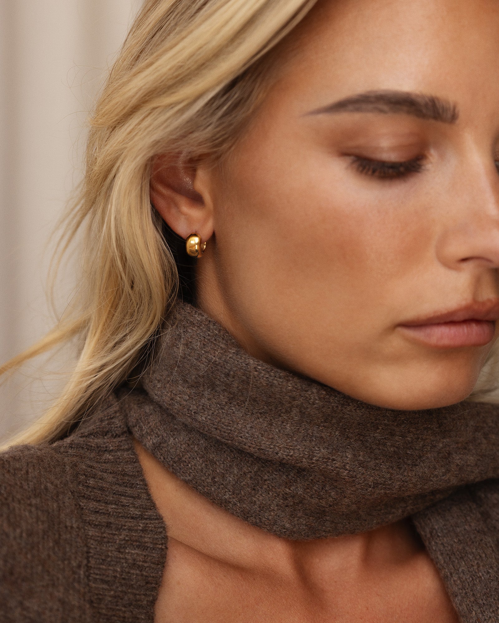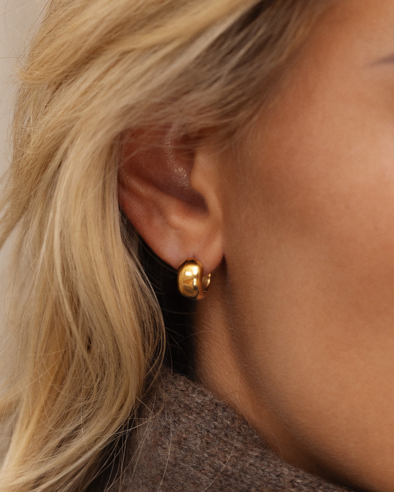 Brave Mini Hoops in a gold-tone finish feature a softly domed, compact design that sits close to the ear. Made from stainless steel plated with 18K gold using PVD technology, they retain their shine with daily wear. Wear them solo for a clean look or pair with smaller studs for a personal touch.