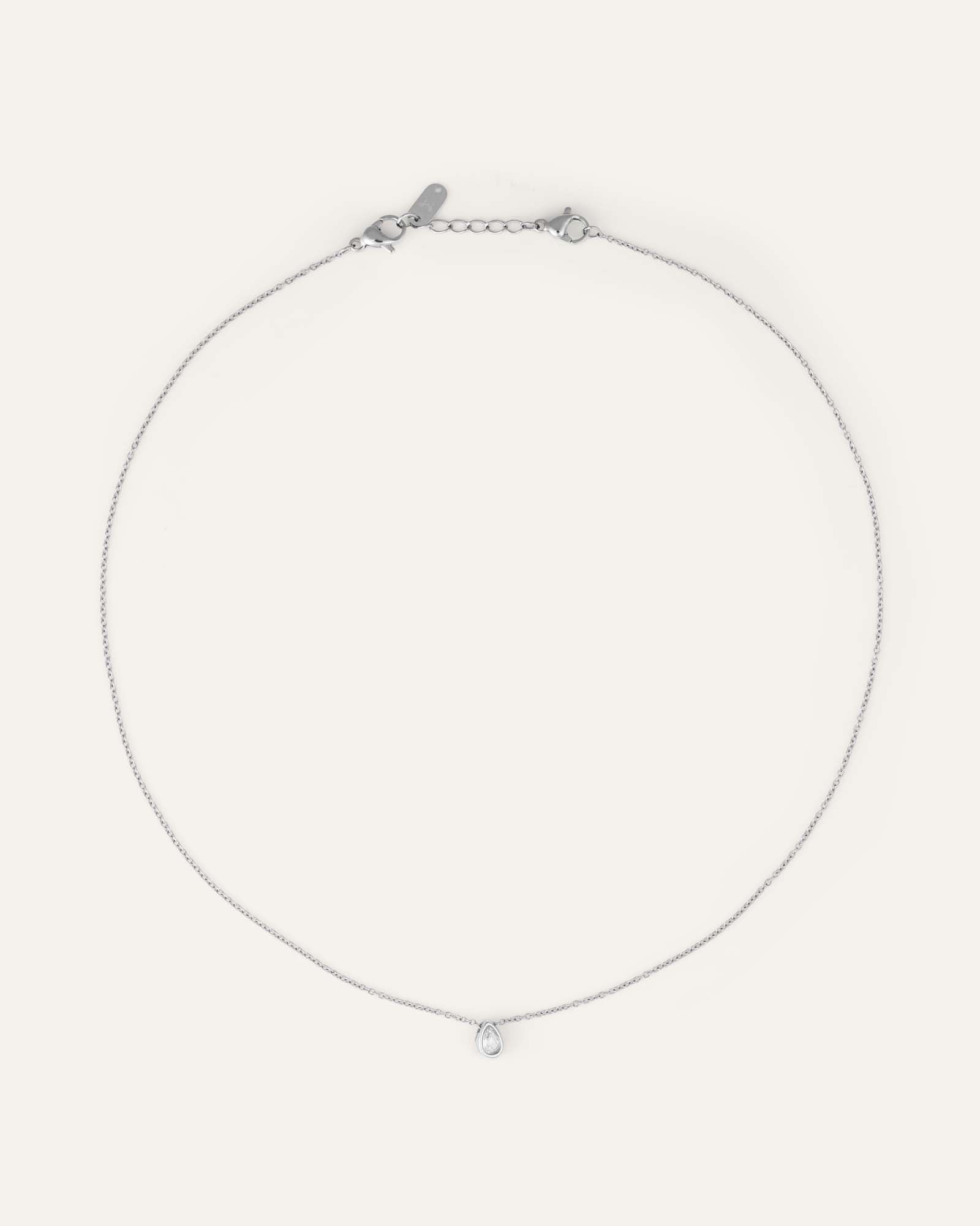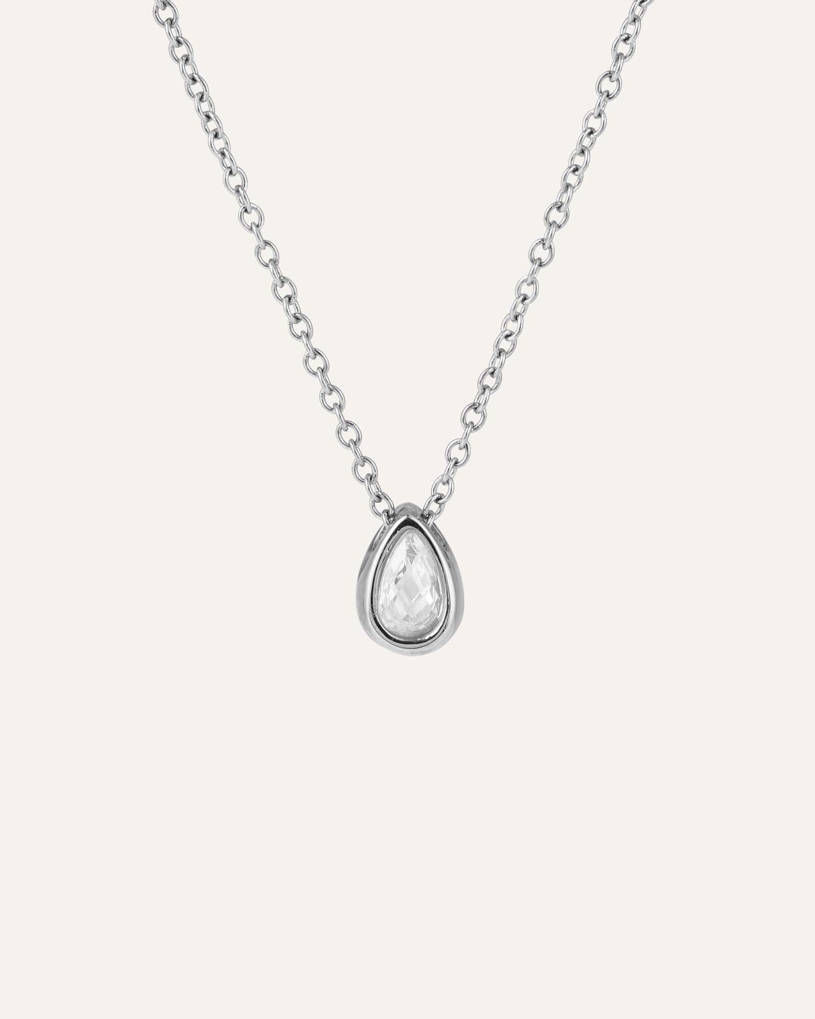 A shimmering drop of Scandinavian clarity—polished stainless steel with a white cubic zirconia that rests close to the skin. Water‑resistant by design.