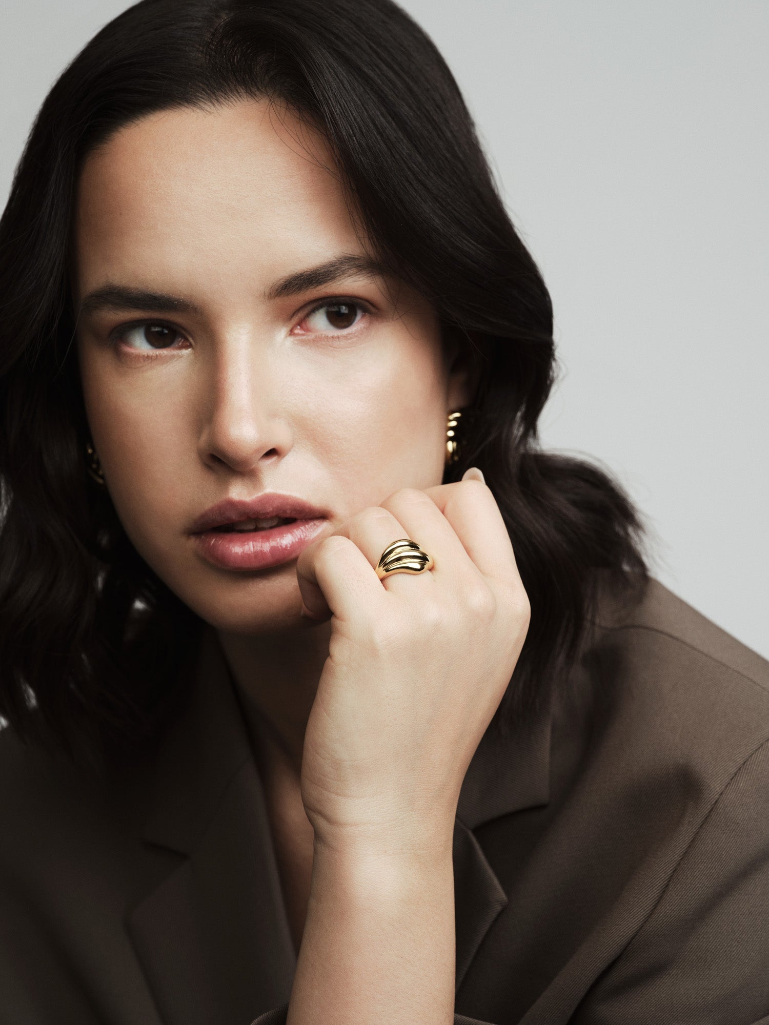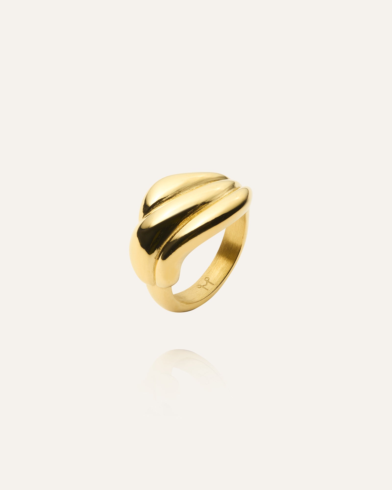 Deco Bold Ring is the perfect ring for those looking for a stylish and bold accessory. Made from durable steel with 18k gold plating, this ring combines a sturdy construction with a timeless shine.