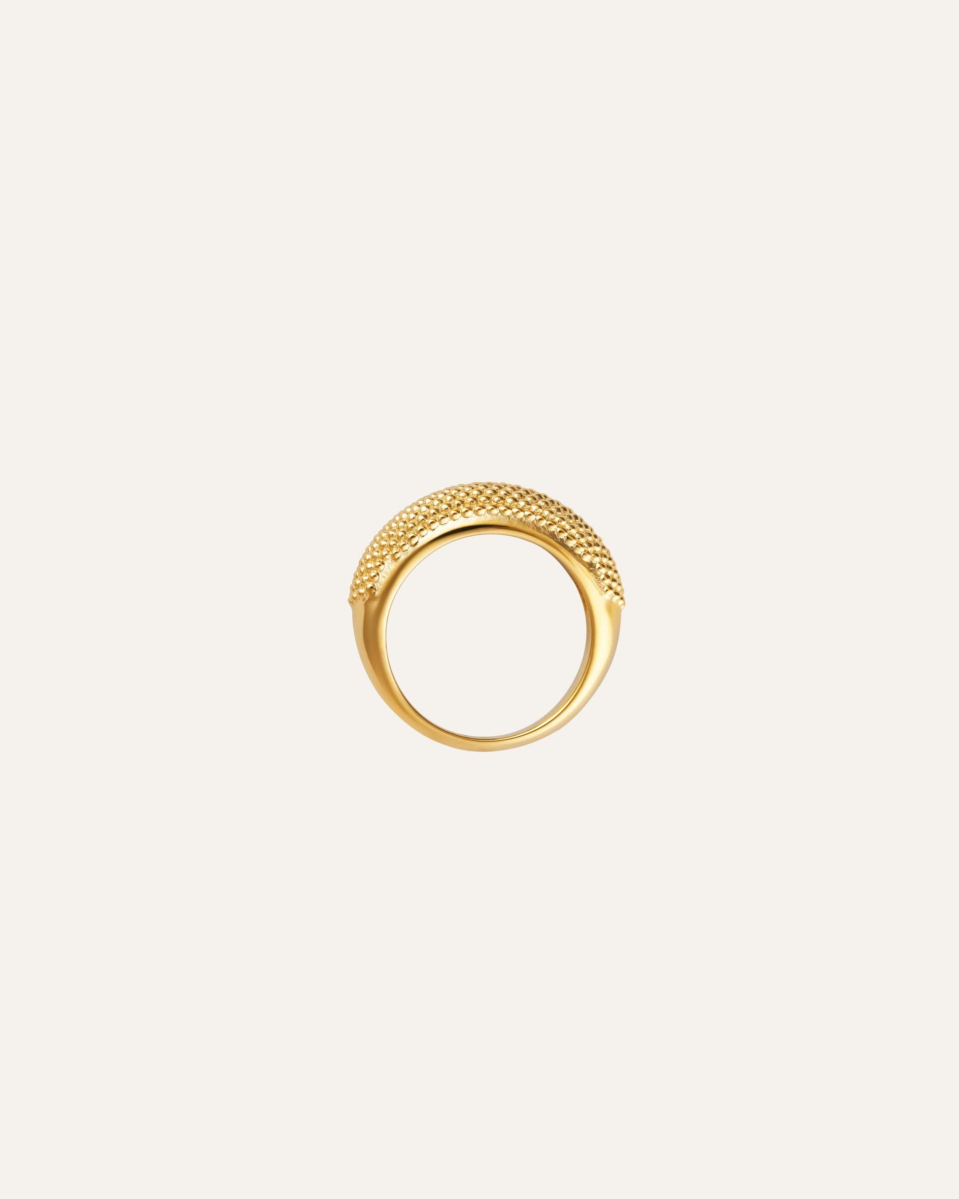 Honey Ring – A rounded design with a structured pattern. Made from solid stainless steel with 18K gold PVD plating, it is water-resistant and durable. Wear it every day – swim, shower, and work out without worrying about it losing its color.