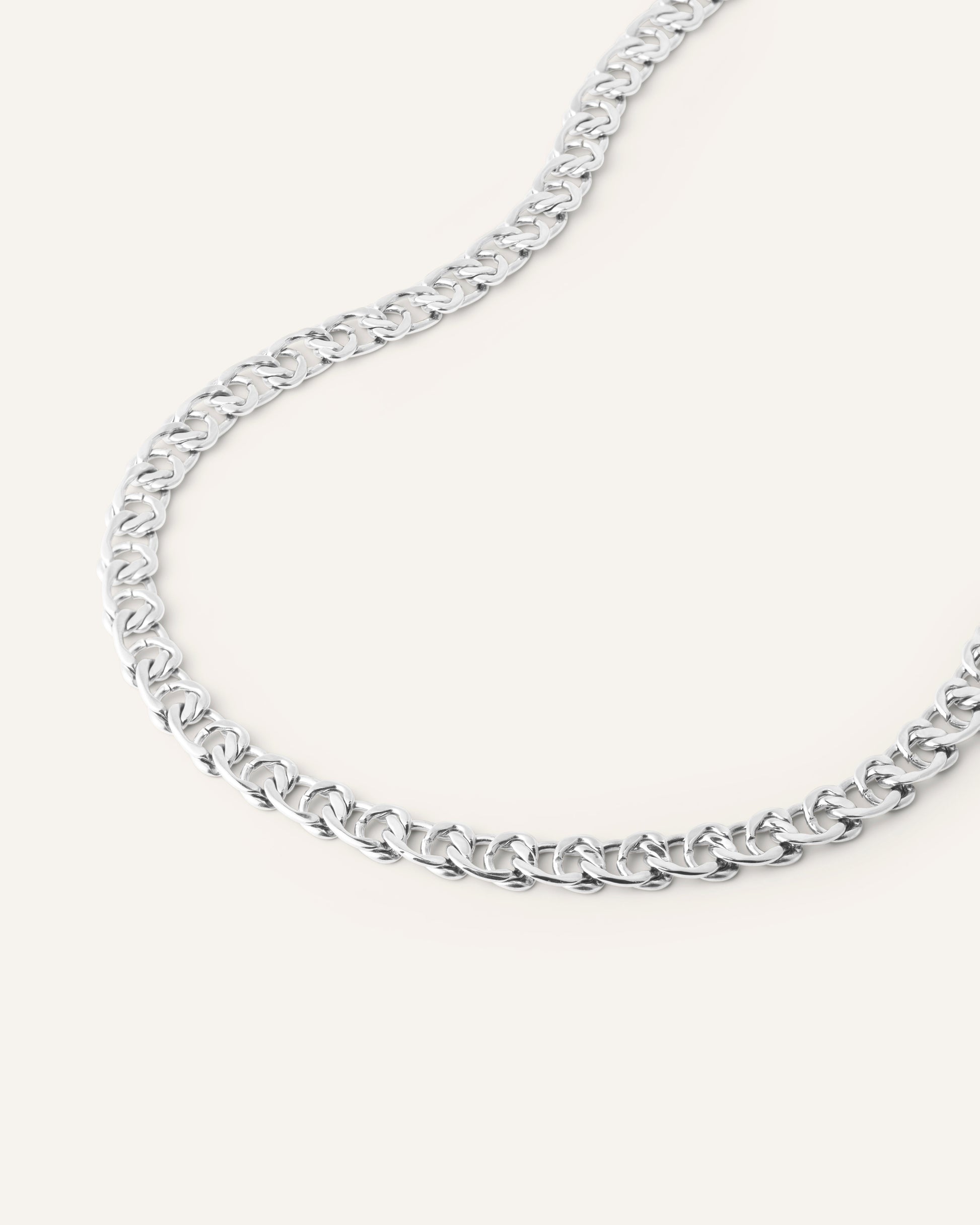 More chain, same clean expression. Infinity Necklace in a wider curb chain creates a distinct, harmonious look around the neck. Crafted from stainless steel in a silver tone that withstands daily wear and keeps its shine. Water-resistant and easy to adjust—the extension chain can be removed for a perfect fit.