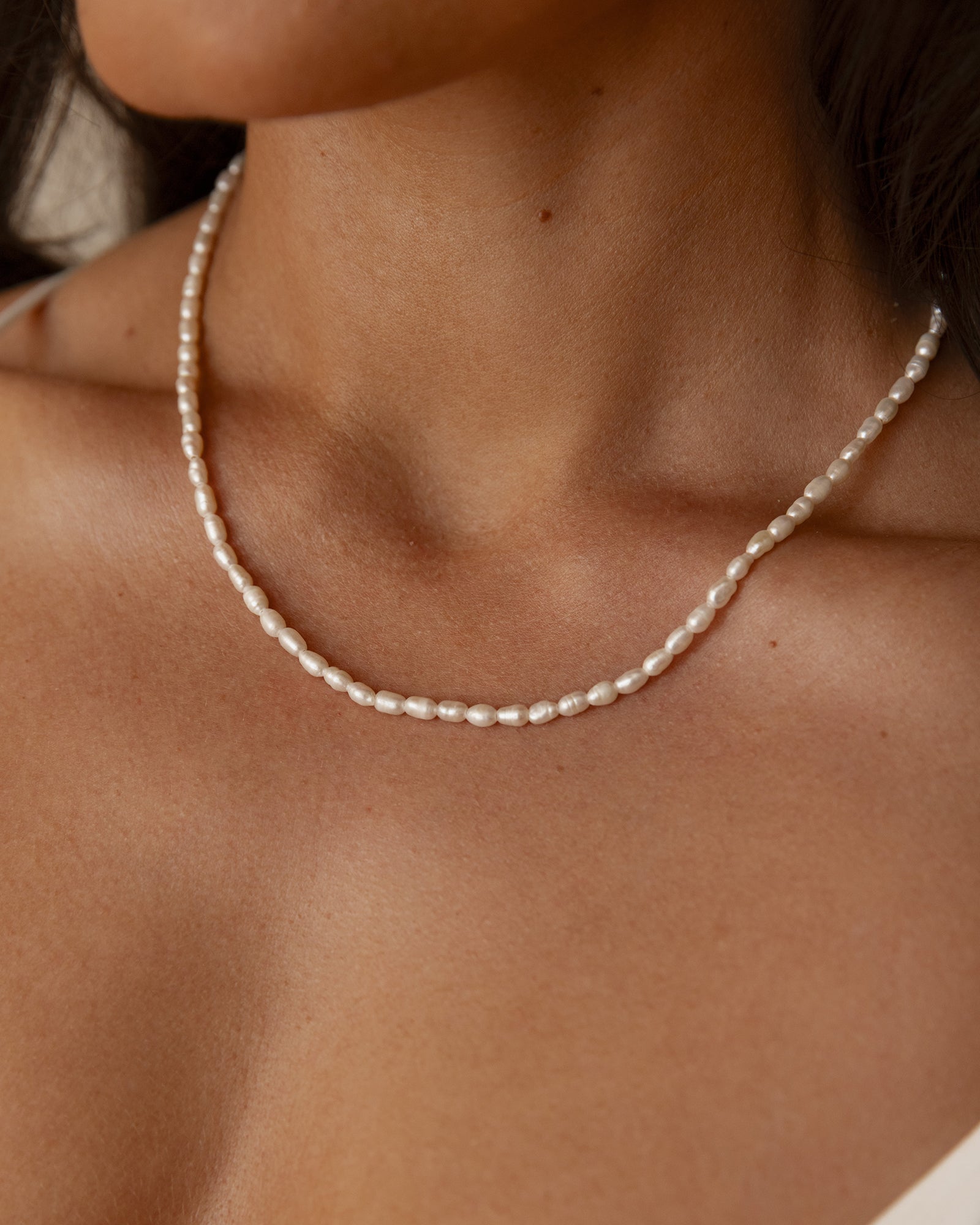 The Pearl Gold Necklace combines freshwater pearls with a stainless steel chain plated in 18K gold PVD. The adjustable length allows the necklace to rest close to the neck, creating a sophisticated look.