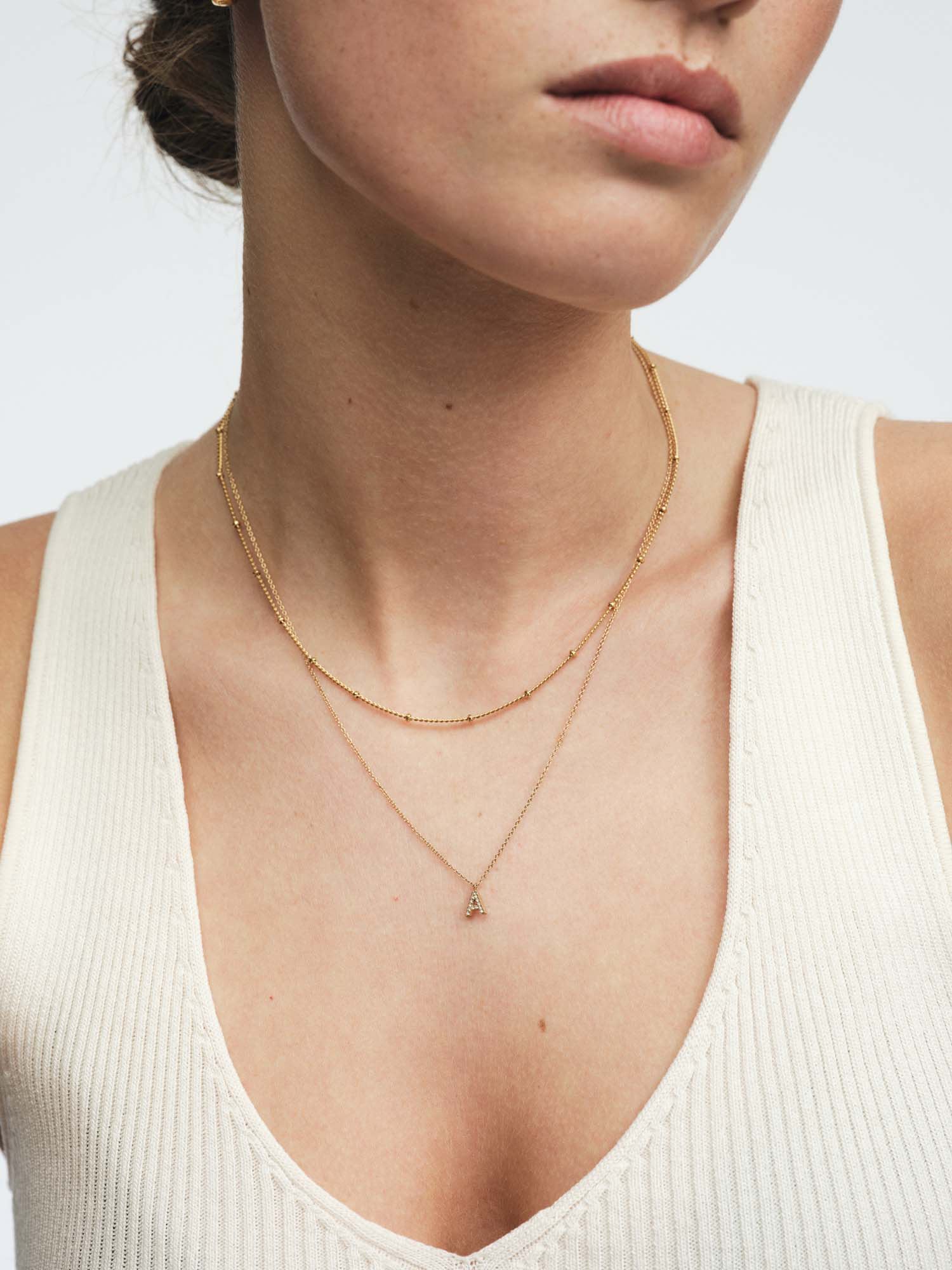 The Petite Stone Letter Necklace is an elegant and personal necklace with a thin chain and a 6 mm letter charm adorned with sparkling stones.