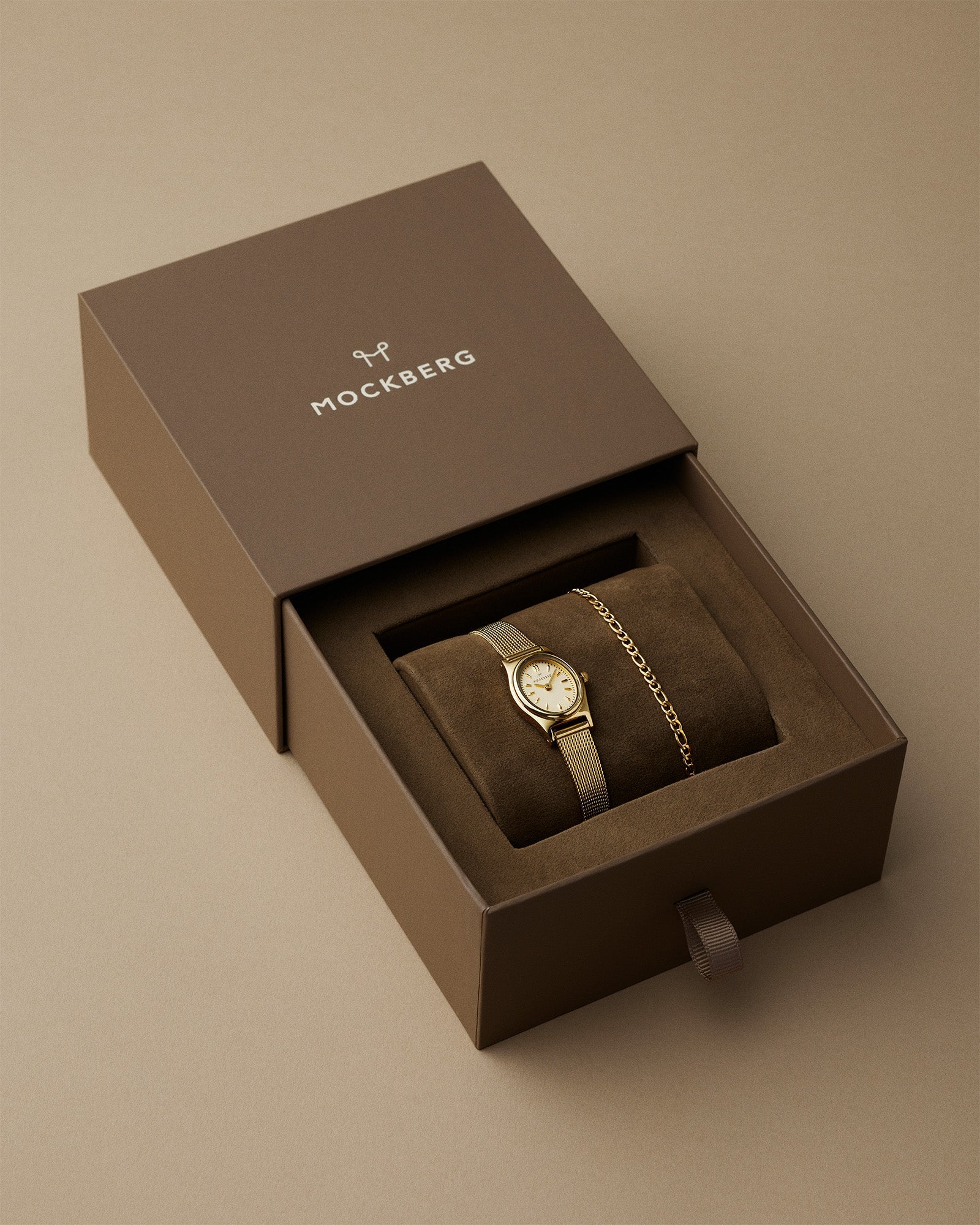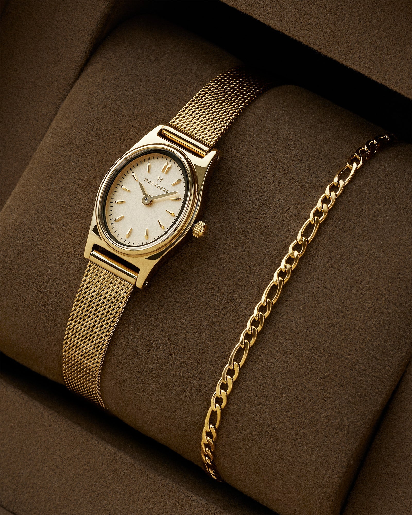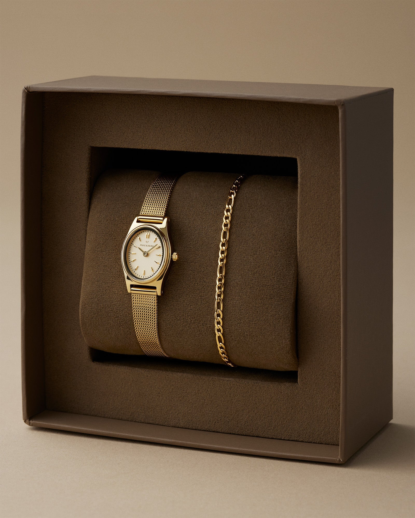 A beautiful box with our Retro Mesh watch and Thin Figaro bracelet. The combination creates the perfect vintage look that suits both everyday wear and special occasions. The watch and bracelet come in a box, making this the ultimate gift for someone you hold dear!