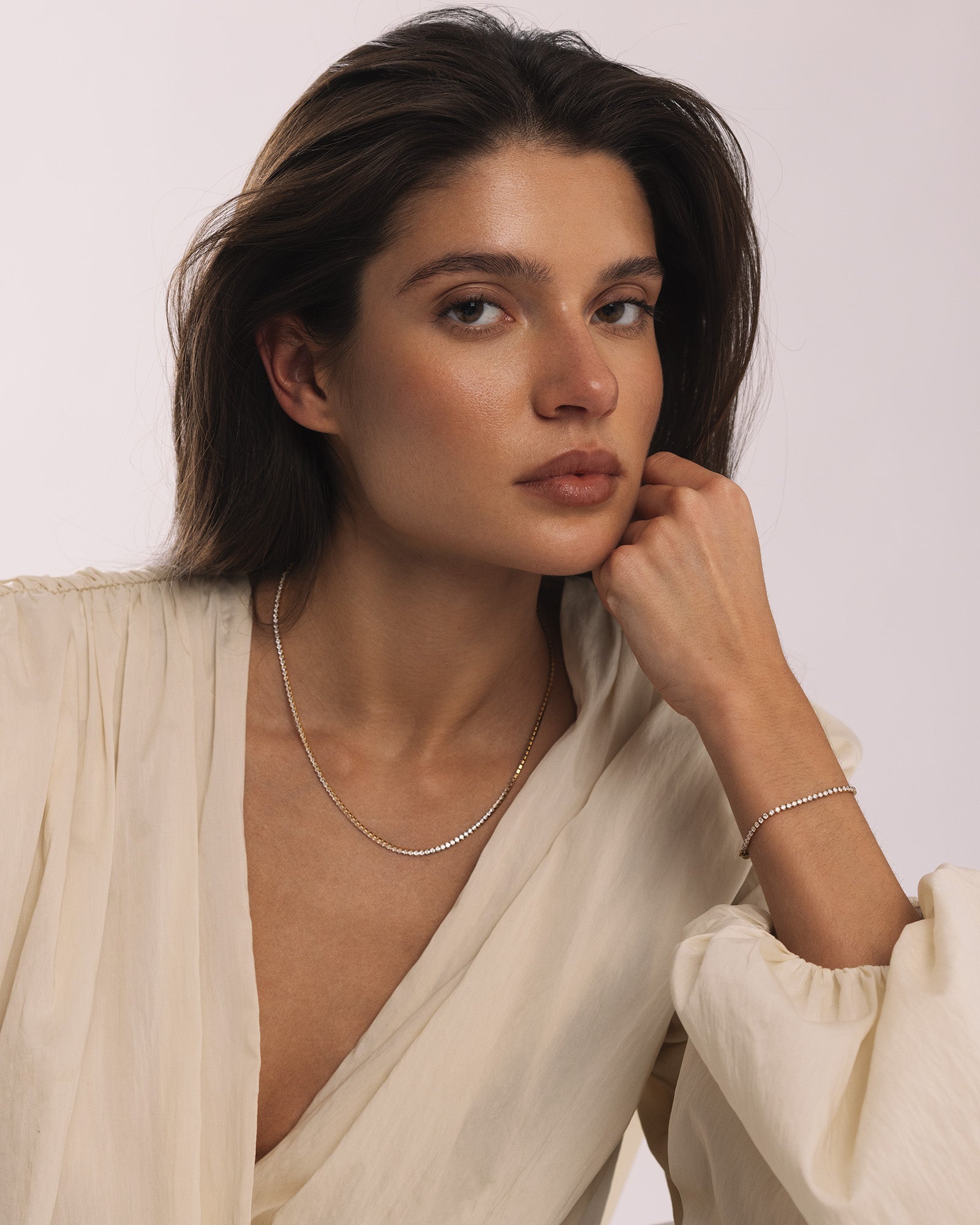 Shiny Tennis Bracelet is a bracelet designed with sparkling cubic zirconia stones running along the entire chain. Made from stainless steel with 18K gold PVD plating, it is both durable and water-resistant, ensuring it retains its color and shine over time.