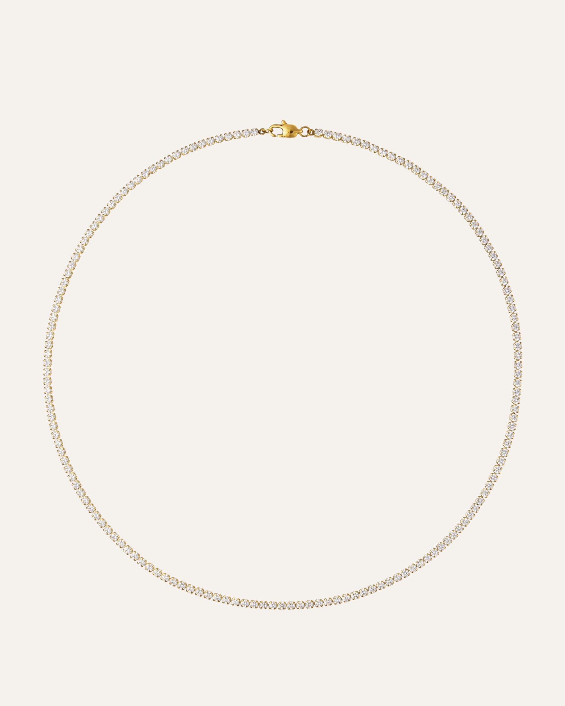 Shiny Tennis Necklace is a thinner version of our classic Tennis Necklace, designed with sparkling cubic zirconia stones running along the entire chain. Made from stainless steel with 18K gold PVD plating, it is both durable and water-resistant, ensuring it retains its color and shine over time. Perfect to wear alone or layered with other necklaces.