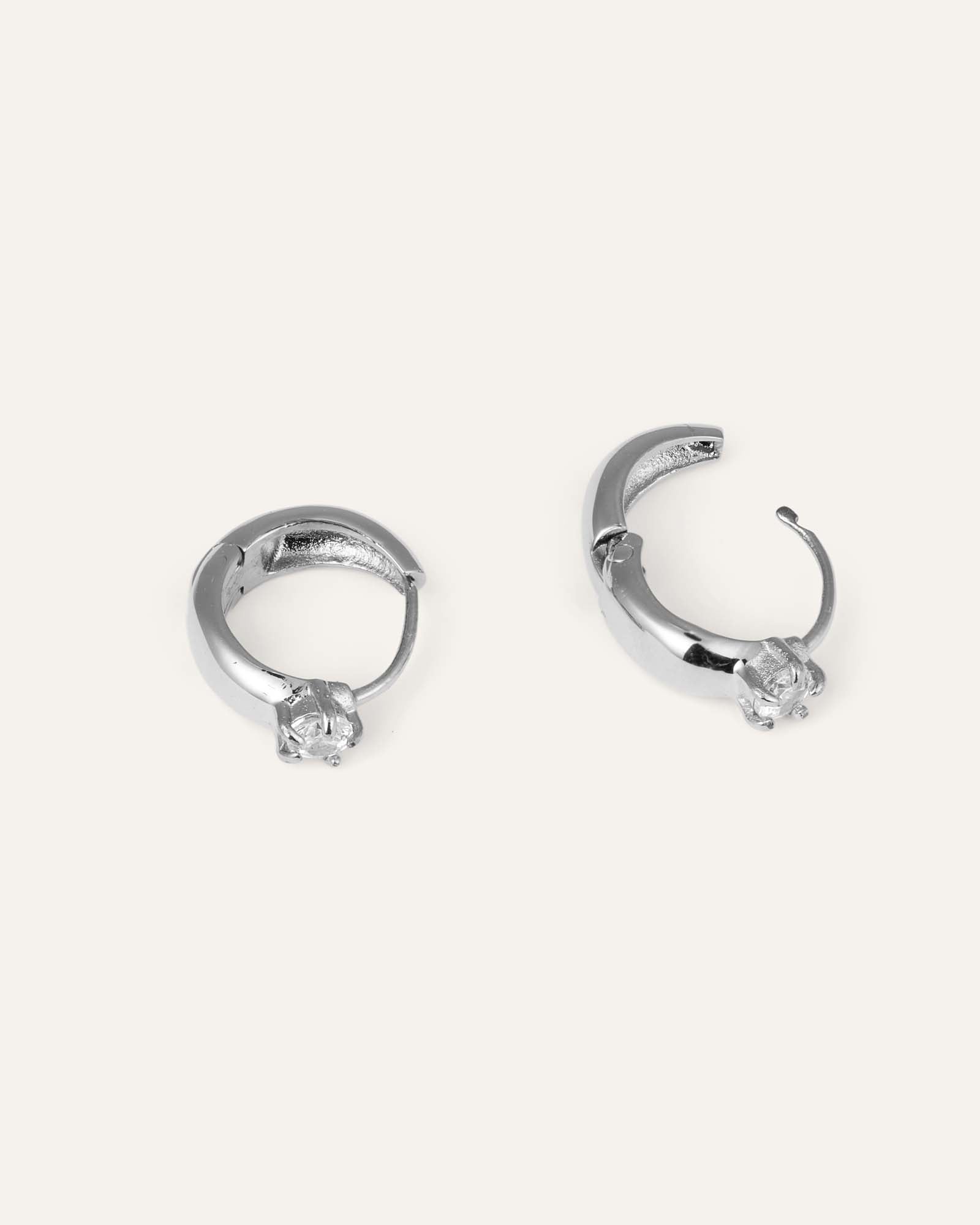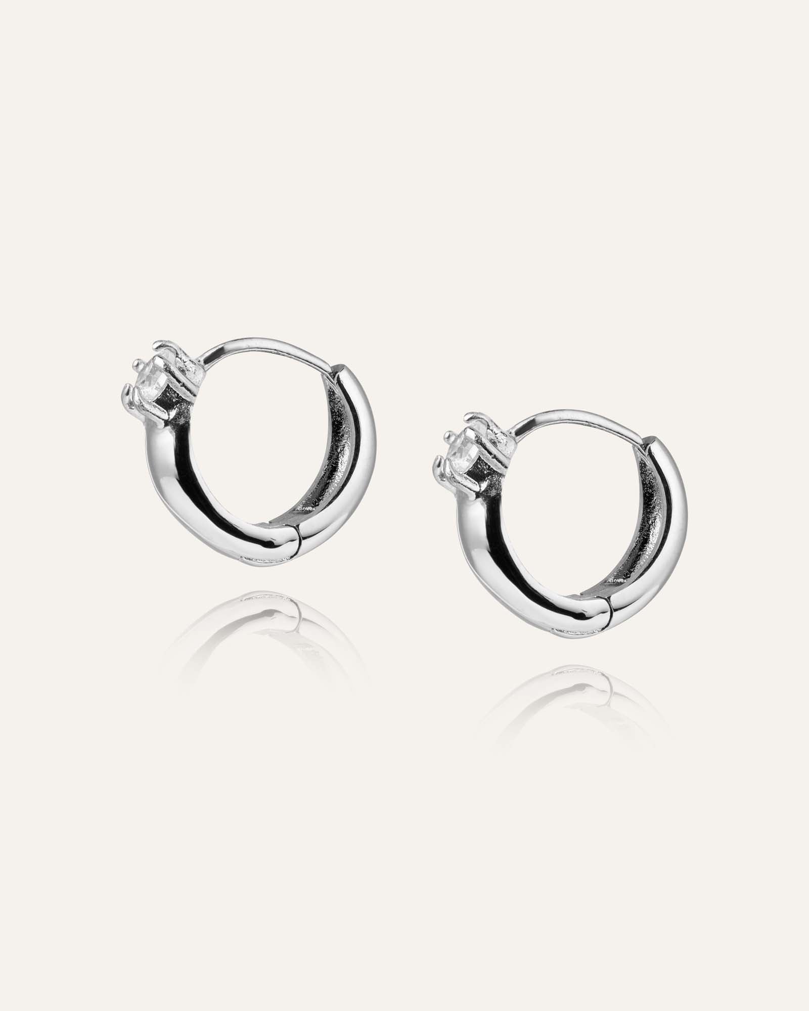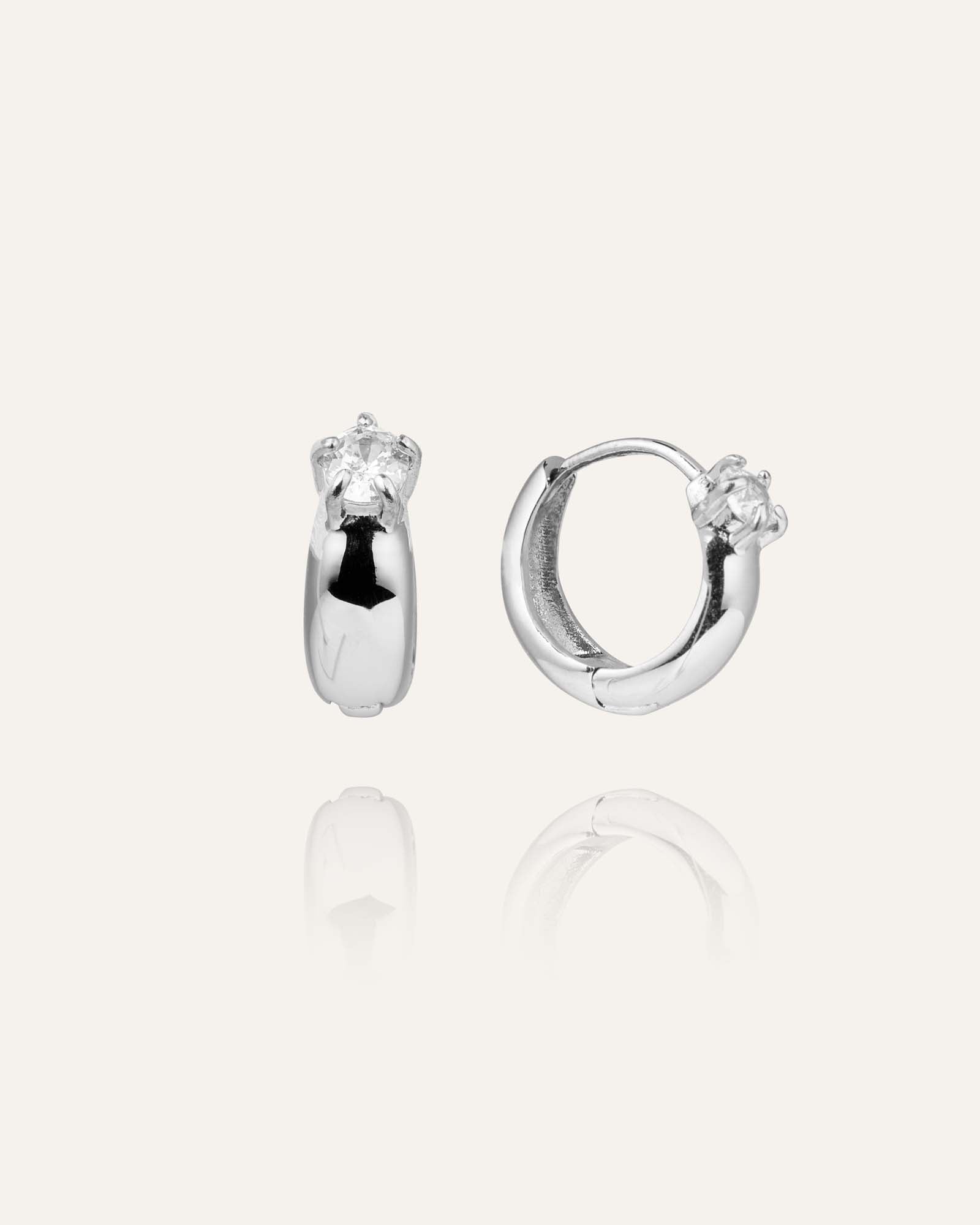 Polished stainless steel in a perfect circle embraces a sparkling white cubic zirconia. Water‑resistant so you can wear them through waves, summer rain and every day.