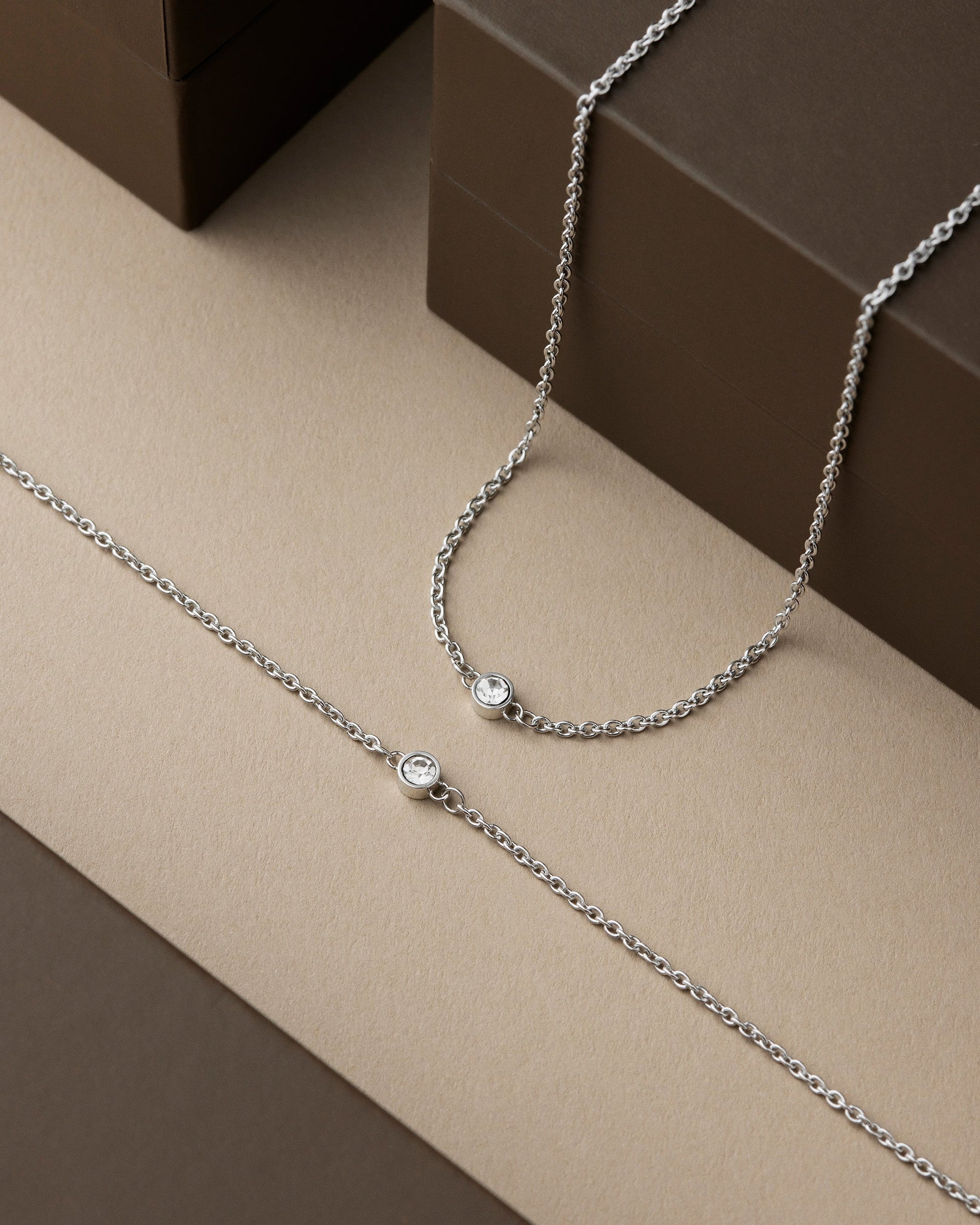 Cool shimmer in two pieces. Thin Diamond in silver-tone frames wrist and neckline with a clean, timeless feel, where the bezel-set stone catches the light discreetly. Easy to style, easy to love — every day.