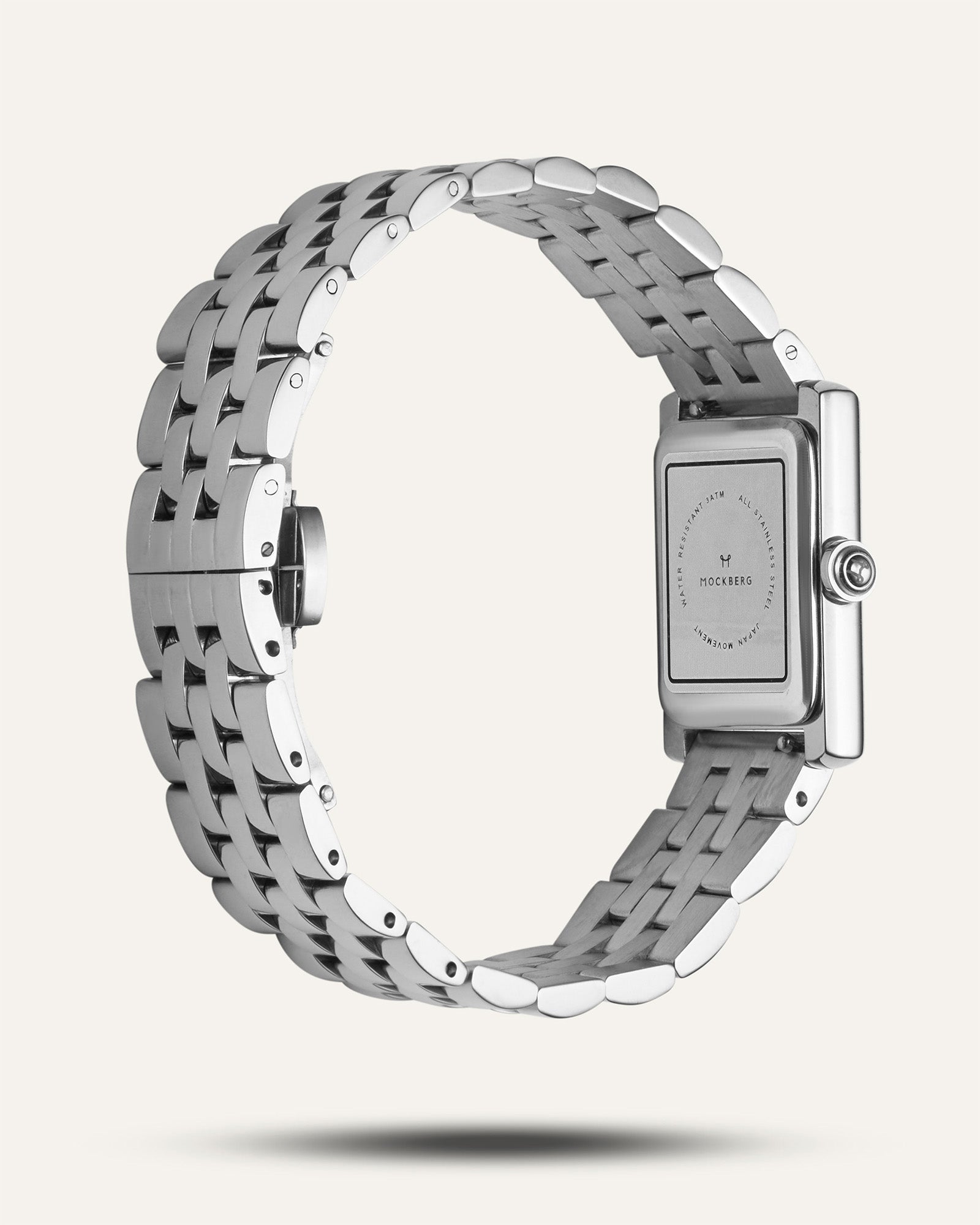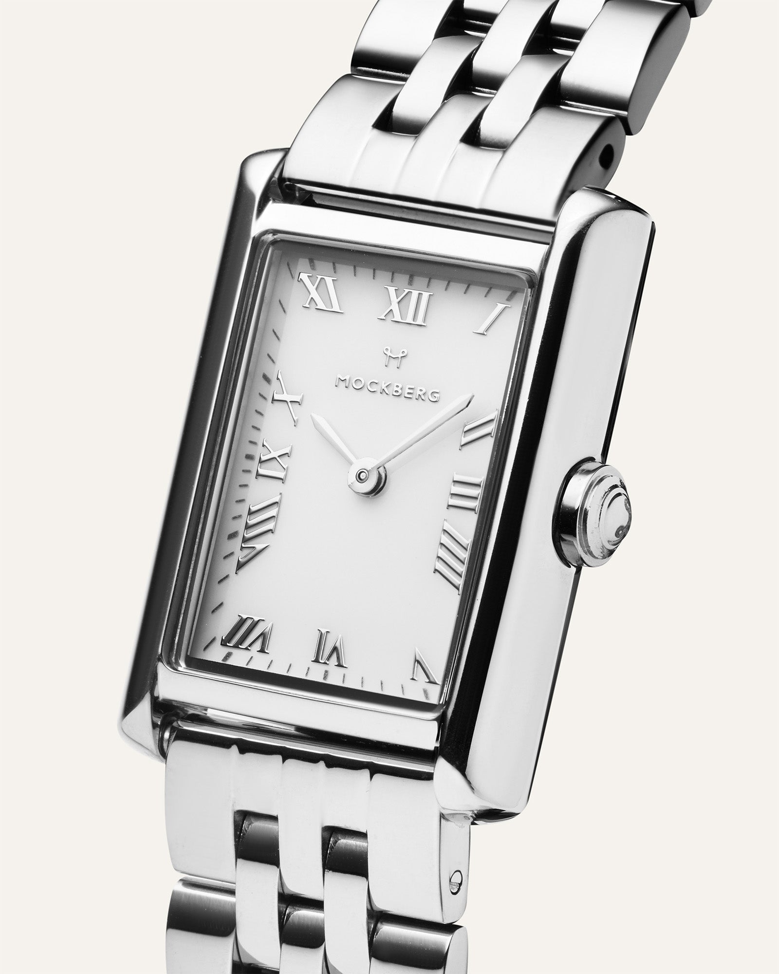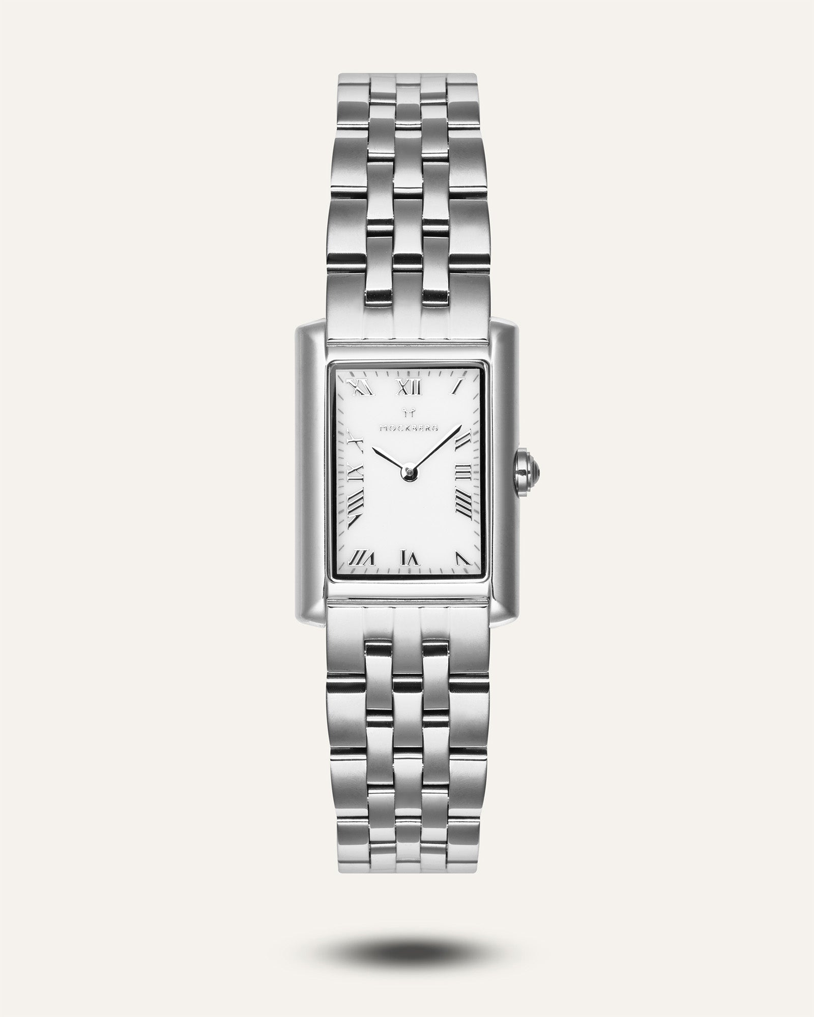 Our bestseller, now in a larger size! The rectangular case in solid stainless steel measures 23 x 31 mm and frames an elegant dial with Roman numerals. Equipped with a Japanese movement and a classic link bracelet, it’s a timeless accessory for any occasion.