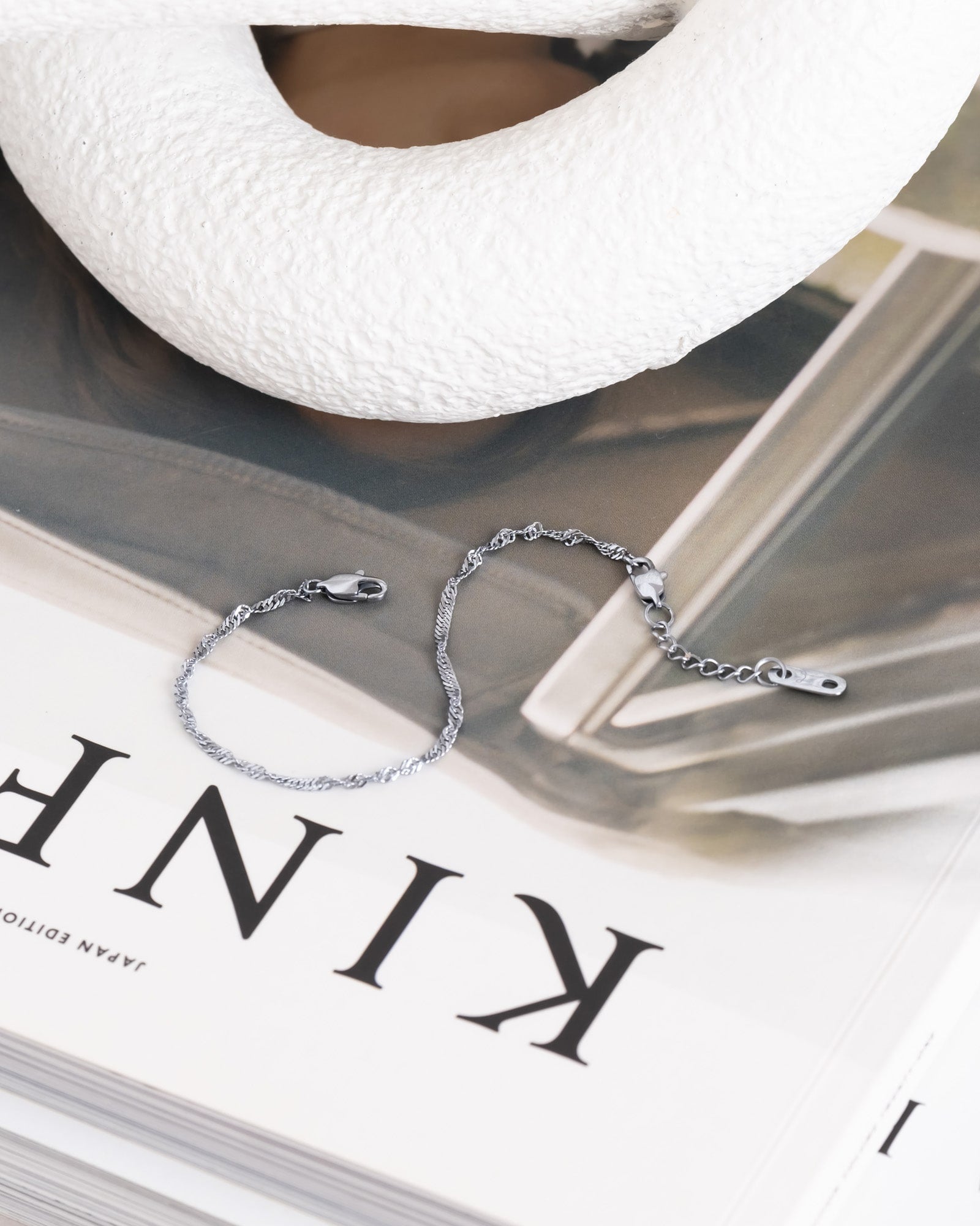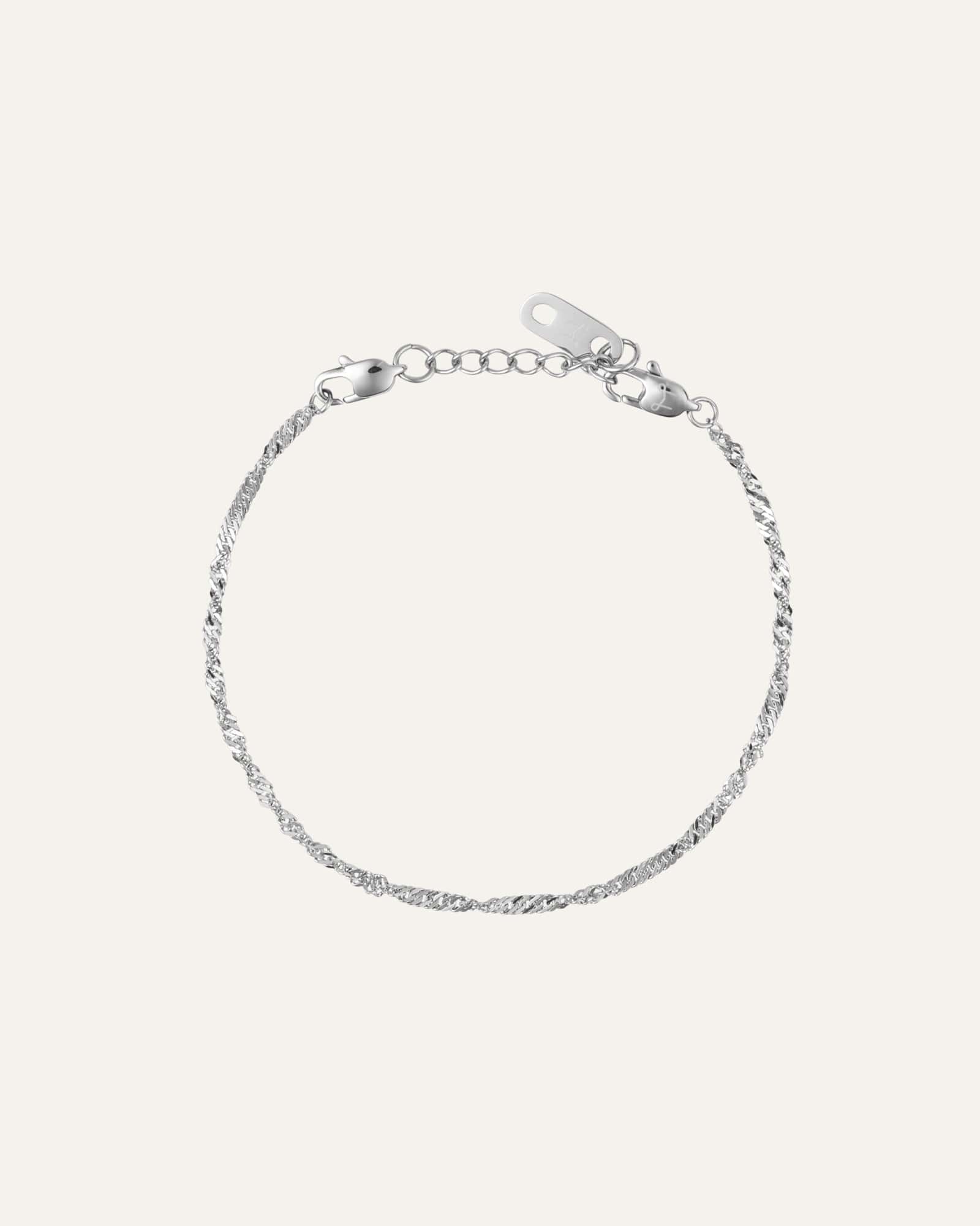Twirl Bracelet is a bracelet with a thin, twisted chain design. A timeless detail that looks great alone or combined with other bracelets. Made from stainless steel with PVD plating, it is both durable and water-resistant, ensuring it retains its color and shine over time. The extension chain can easily be removed for a customized fit.