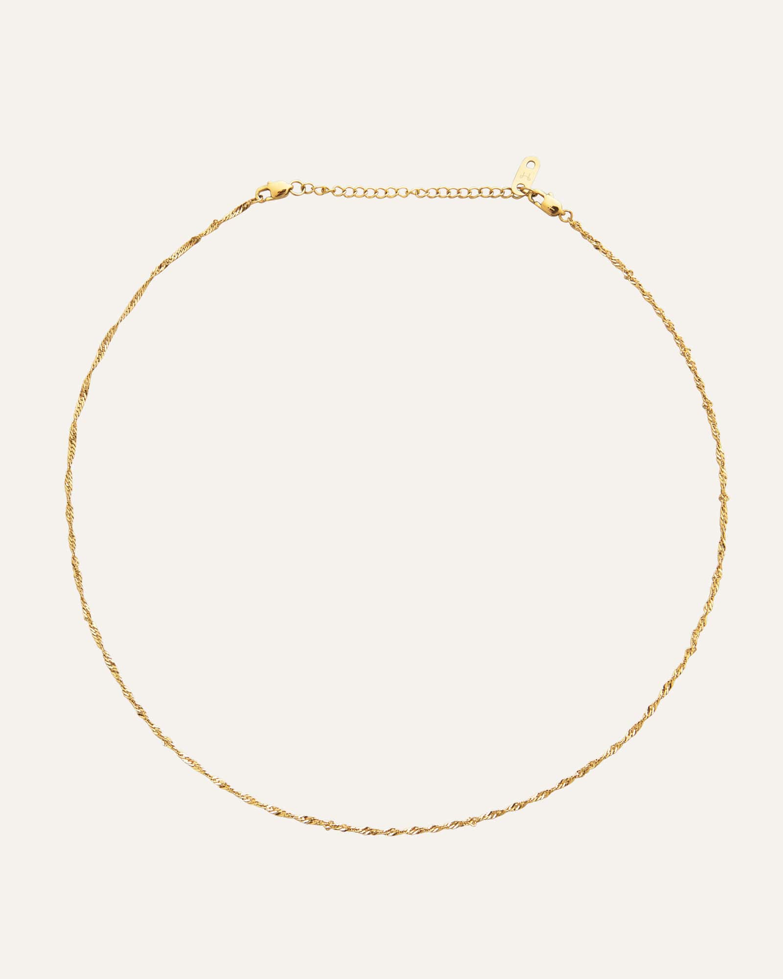 Twirl Necklace is a necklace with a thin, twisted chain. Perfect to wear on its own or layered with other necklaces. Made from stainless steel with 18K gold PVD plating, it is both durable and water-resistant, ensuring it retains its color and shine over time. The extension chain can easily be removed for a customized fit.